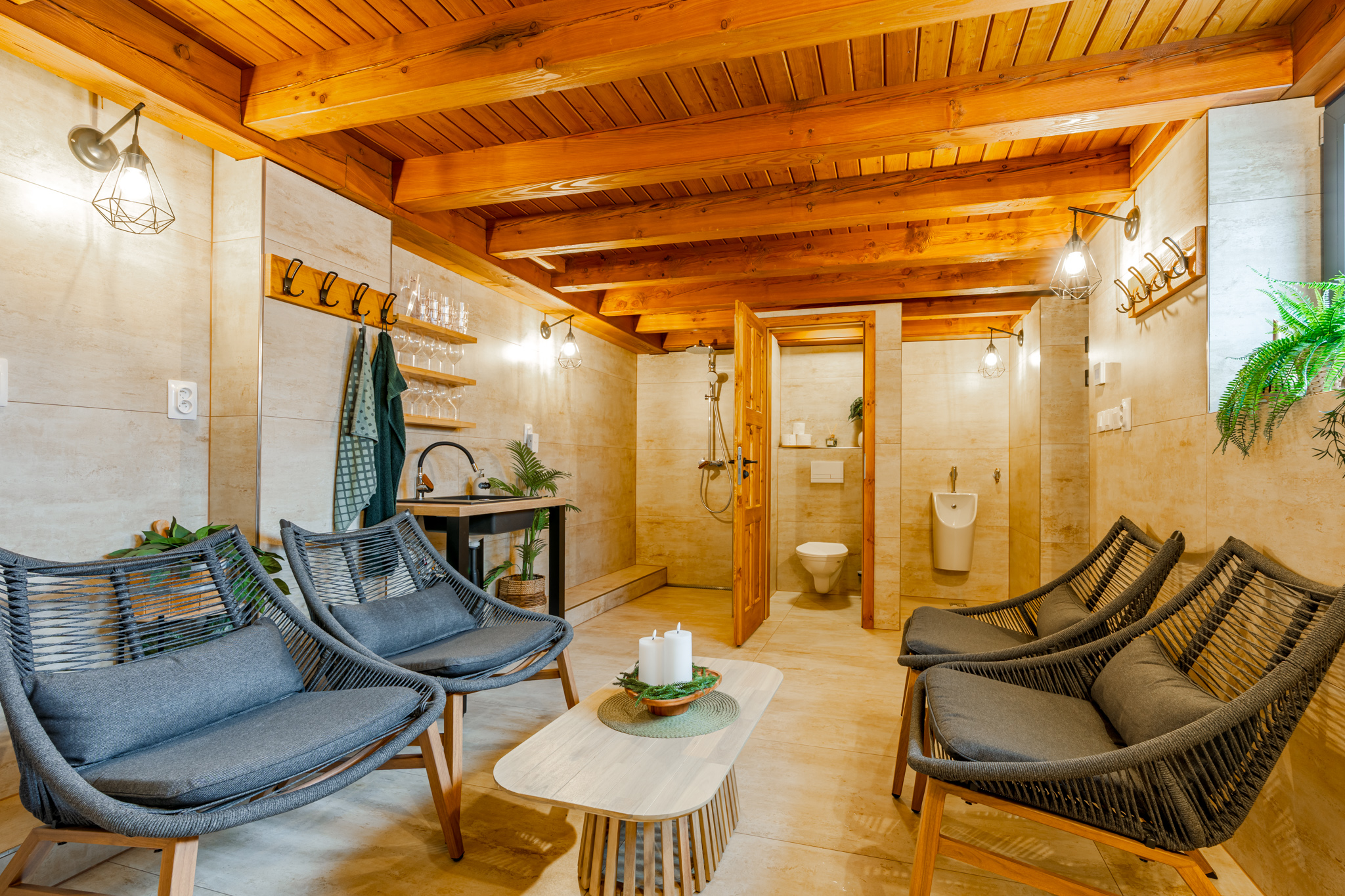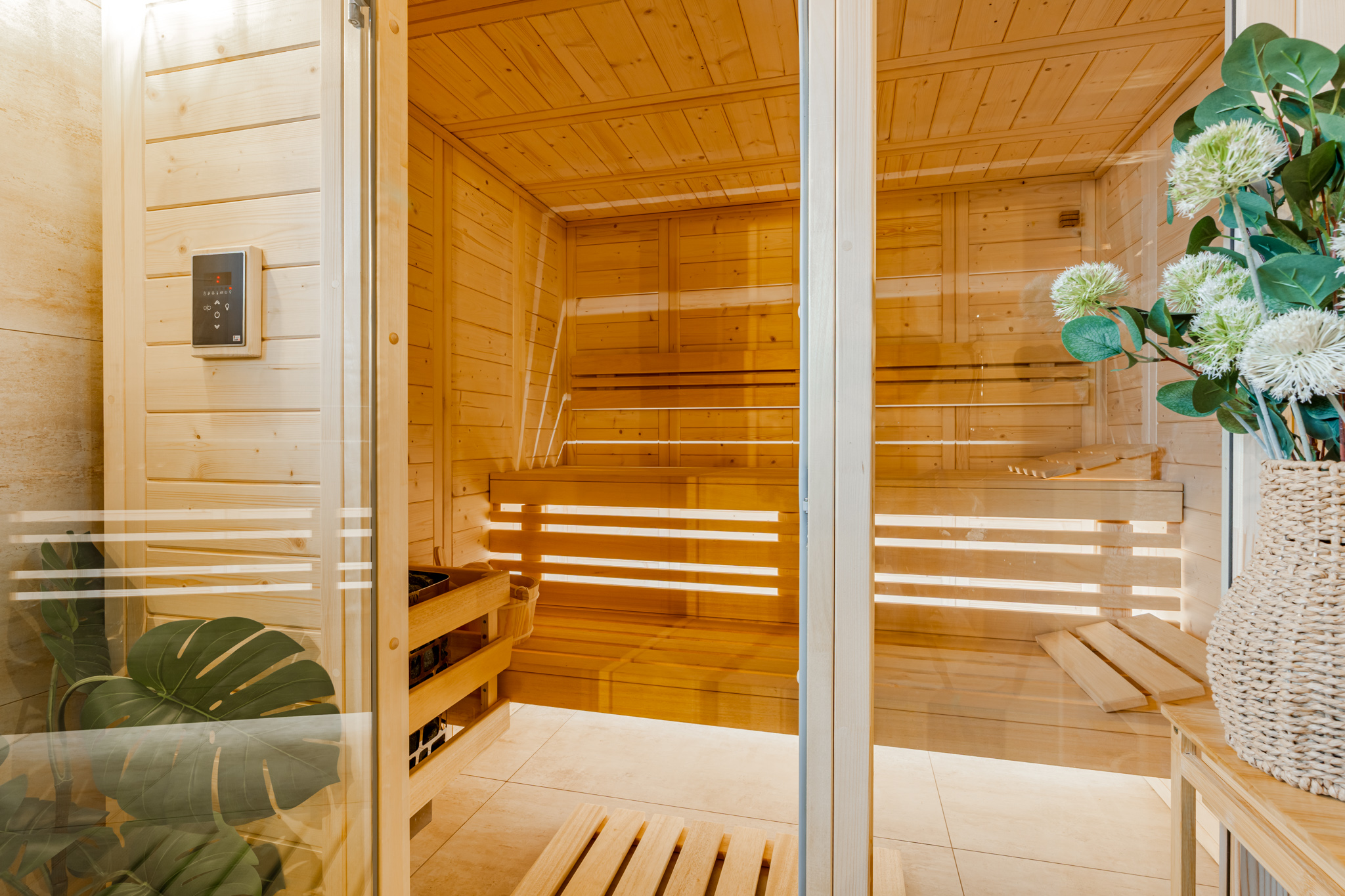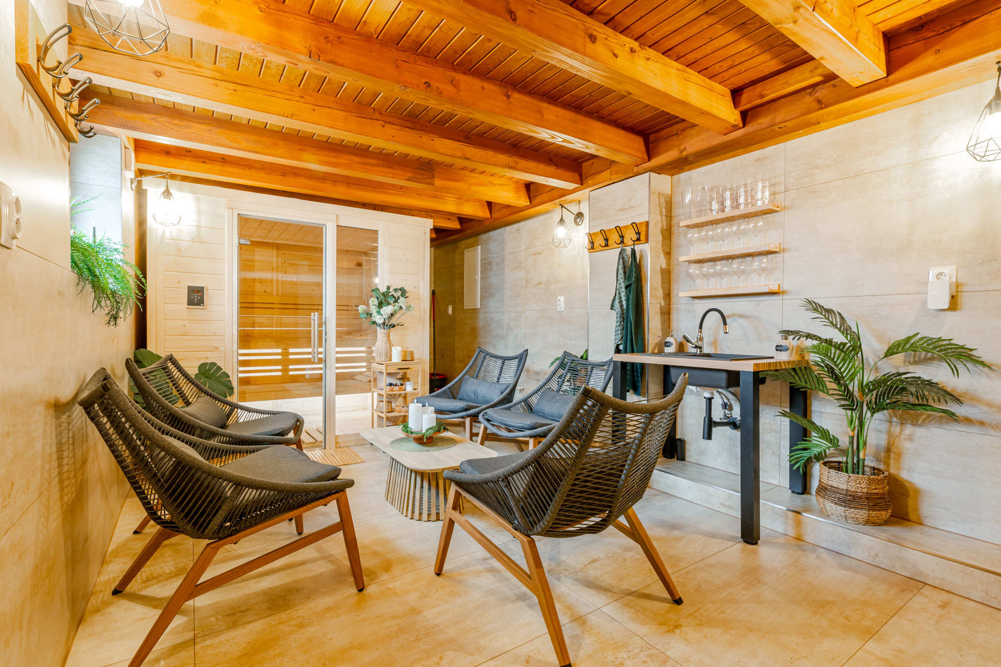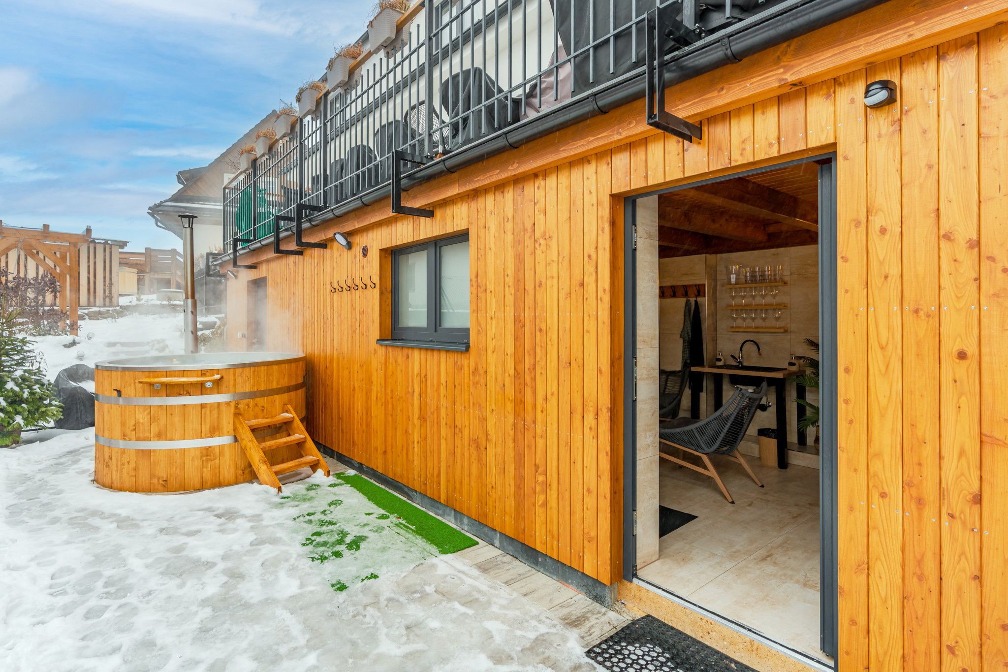 Pro oba apartmány je k dispozici společná relaxační zóna, kde si hosté mohou užít finskou saunu a koupací sud – ideální kombinaci pro regeneraci po dni plném aktivit.