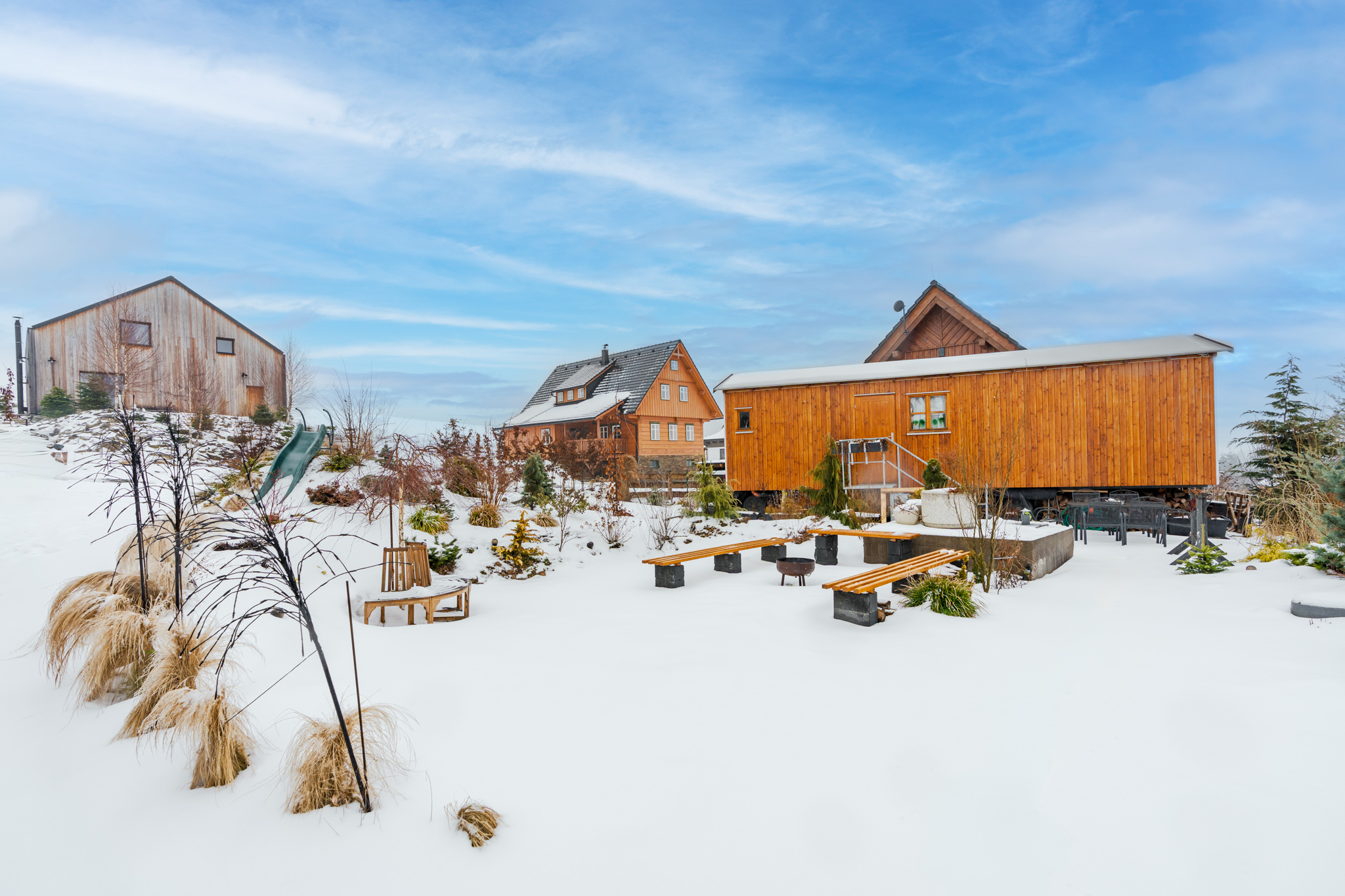 Součástí areálu je také rozlehlá zahrada s ohništěm, ruskými kuželkami, skluzavkou pro děti a dalšími venkovními hrami, které potěší jak dospělé, tak nejmenší hosty.