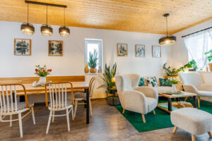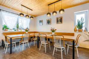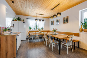 Na kuchyň plynule navazuje jídelna se dvěma stoly, lavicí a židlemi, která poskytuje dostatek prostoru pro společné stolování celé rodiny či skupiny přátel.