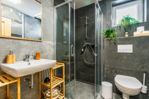 V patře se nachází dvě koupelny, každá vybavená sprchovým koutem, toaletou a fénem. Patrové koupelny zajišťují dostatek prostoru pro všechny hosty a komfortní využití apartmánu i při plné kapacitě.